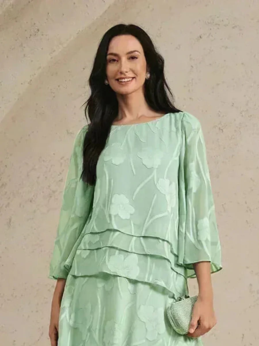 Embrace romantic elegance with this charming two-piece set. The blush-toned blouse features delicate floral embroidery on a sheer overlay, with cape-style layered sleeves adding feminine charm. Paired with a navy midi skirt featuring a layered chiffon floral pattern and flattering A-line silhouette, this ensemble offers effortless sophistication for spring gatherings to semi-formal events.
